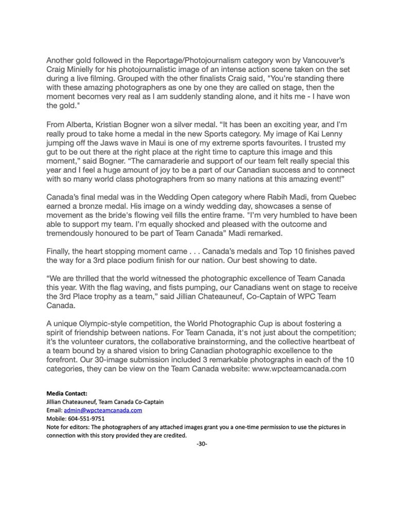Today we celebrate the final standings of Canada’s Top 10 images, including Kari’s 7th place finish, helped secure Canada’s placement in the WPC competition.