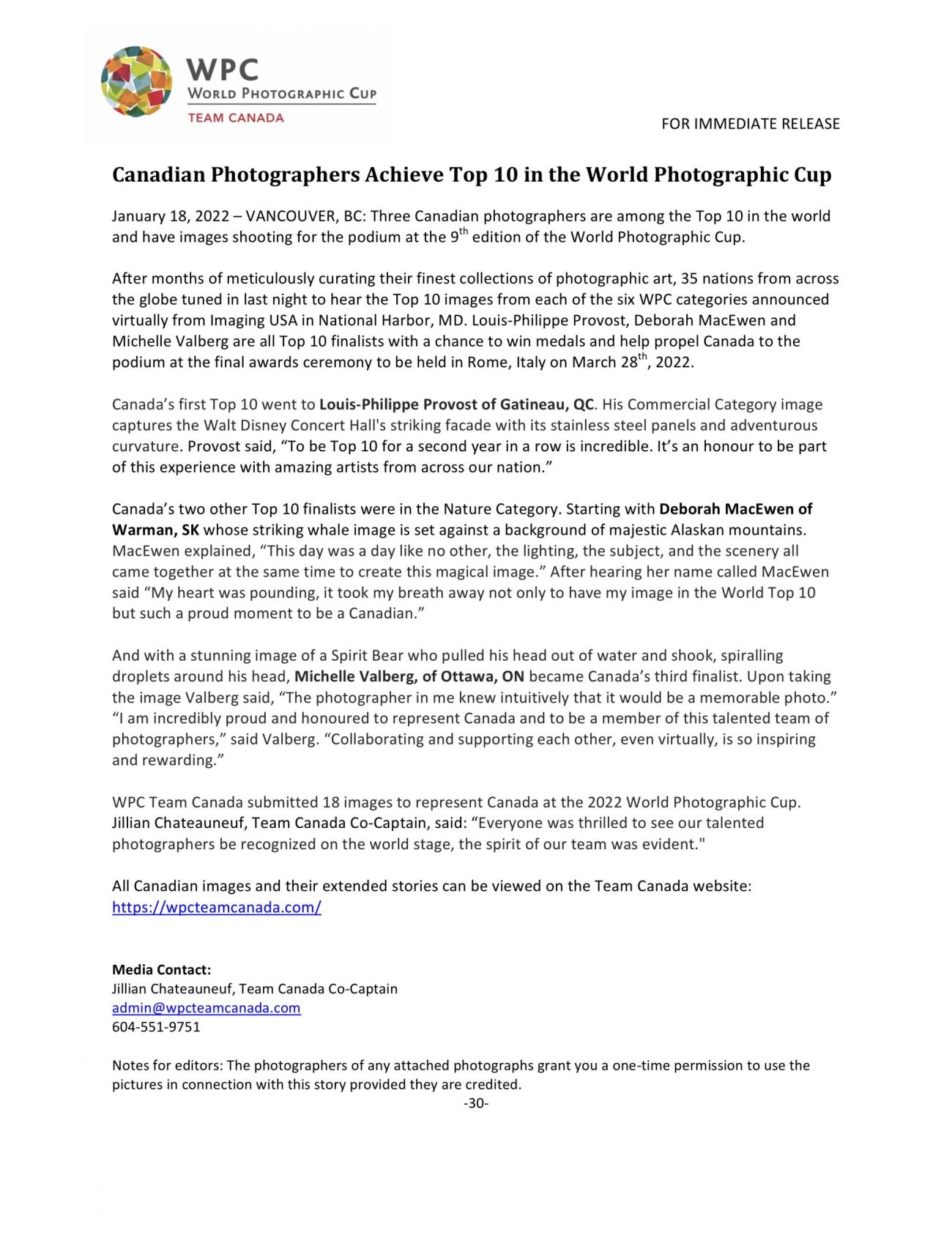 WPC Team Canada wishes her all the best at the upcoming awards ceremony on March 28th, 2022.