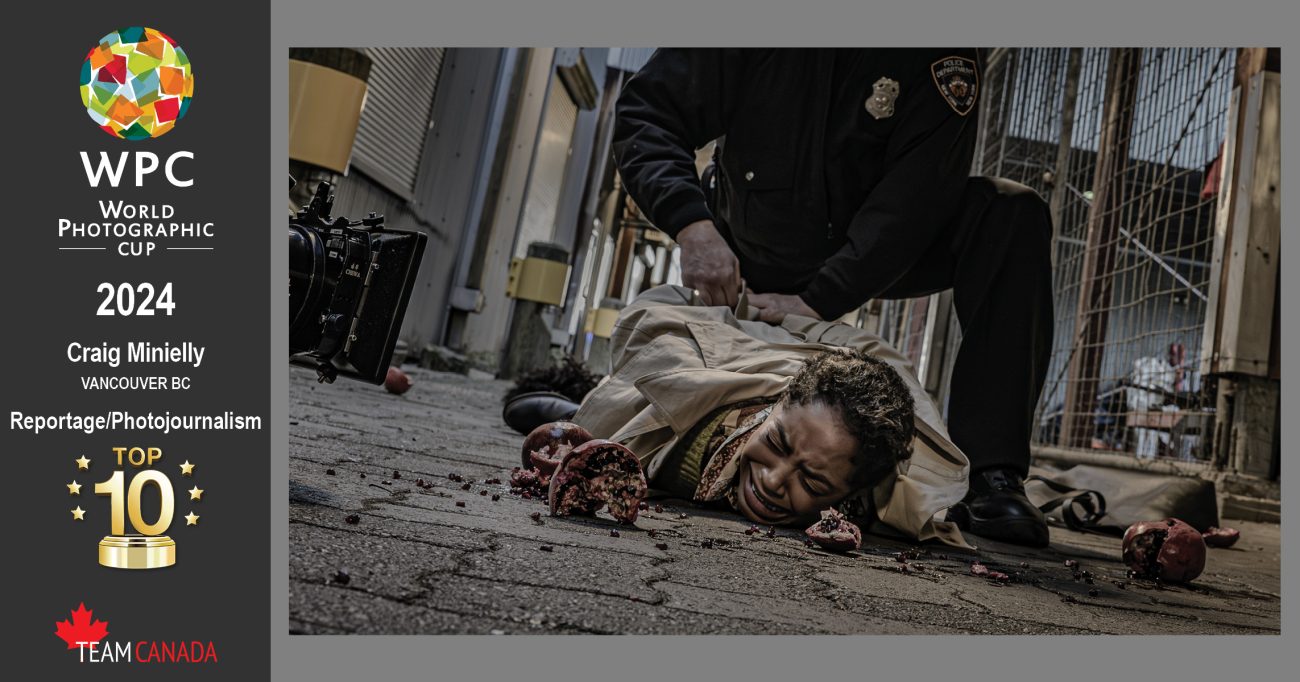 When they announced the Reportage/Photojournalism category Vancouver’s Craig Minielly earned Top 10 honours with a photojournalistic image of an intense action scene taken on the set of a feature film. It’s a split second of huge emotional impact in one of those unplanned moments that can happen during a live filming. “Working at what you love, being honest to the event, and then seeing your work go on to represent Canada and become an International Top 10 finalist is wild,” said Minielly. “This is a wonderful team representing an amazing country.”